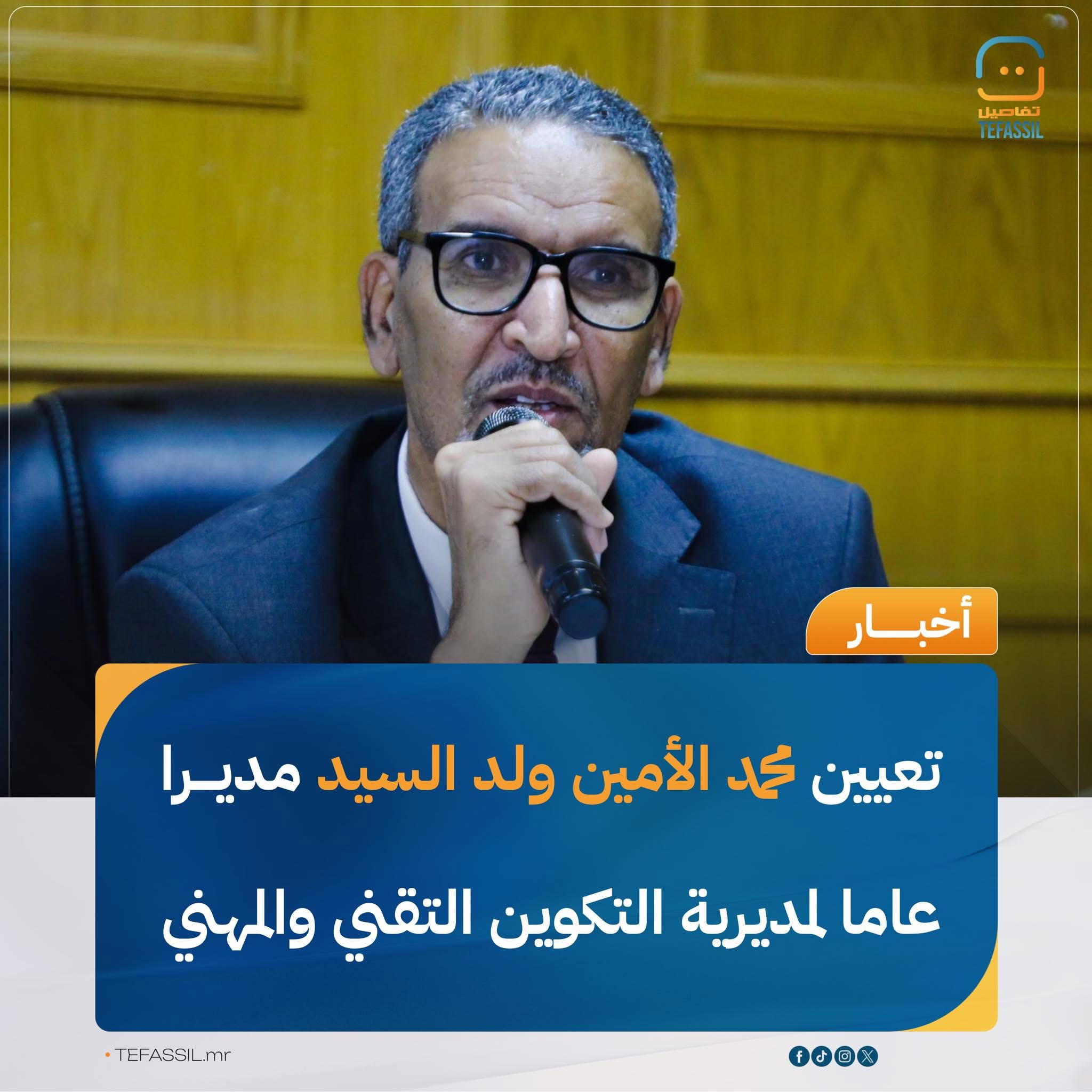 صادق مجلس الوزراء، خلال اجتماعه الأسبوعي، على تعيين محمد الأمين ولد السيد مديرا عاما للمديرية العامة للتكوين التقني والمهني بوزارة التكوين المهني والصناعة التقليدية والحرف.