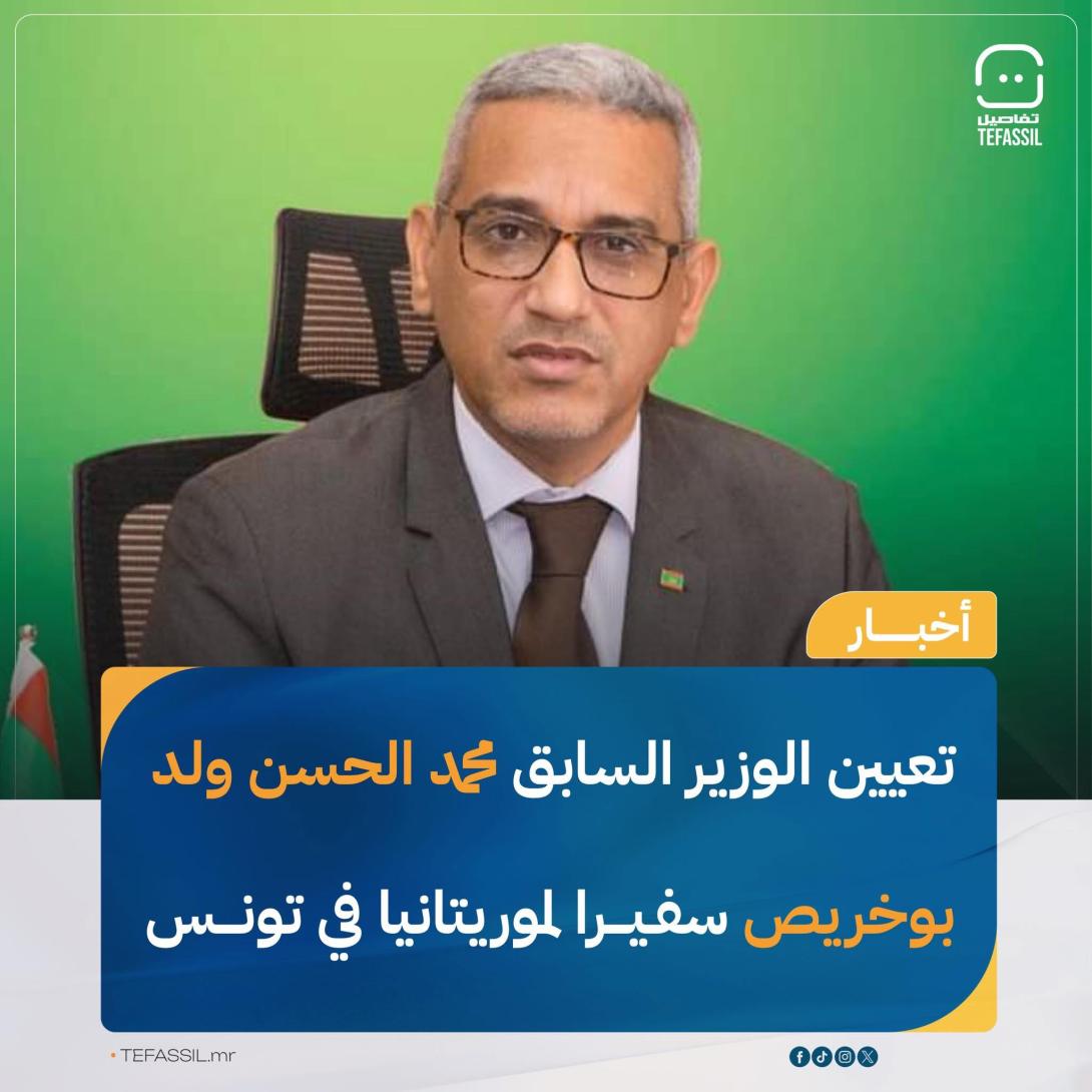 Feb 20 / التعليقات تعيين ولد بوخريص سفيرا لموريتانيا في تونس أفادت مصادر مطلعة لتفاصيل بتعيين الوزير السابق محمد الحسن ولد بوخريص سفيرا لموريتانيا لدى الجمهورية التونسية. جمعة, 2026/02/20 - 15:42