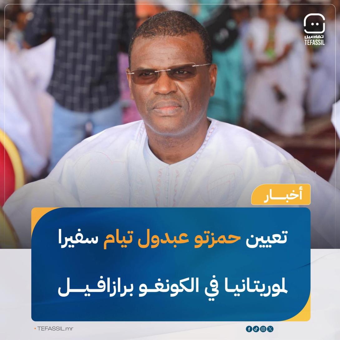 أكدت مصادر مطلعة لـ«تفاصيل» تعيين حمزتو عبدول تيام سفيرا لموريتانيا لدى جمهورية الكونغو برازافيل، وذلك ضمن التغييرات الأخيرة التي شهدها السلك الدبلوماسي الموريتاني.