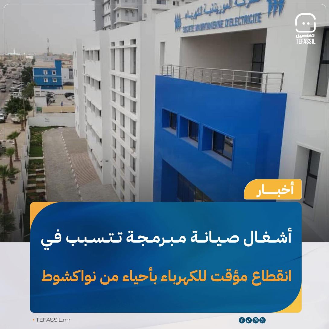 أعلنت الشركة الموريتانية للكهرباء، اليوم الأربعاء، عن برمجة انقطاعات محدودة للتيار الكهربائي في عدد من أحياء العاصمة نواكشوط، وذلك لإجراء أعمال صيانة على شبكة التوزيع.