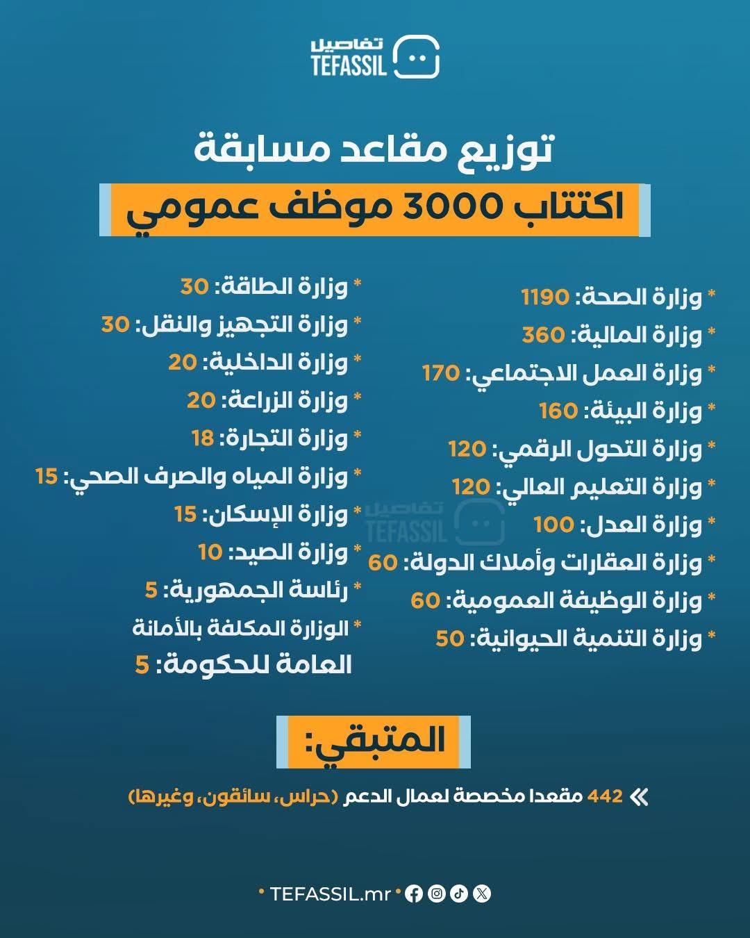 كشفت الحكومة عن توزيع مقاعد مسابقة اكتتاب 3000 موظف عمومي على مختلف القطاعات الوزارية، وذلك وفق الأولويات والحاجيات المسجلة في كل قطاع.