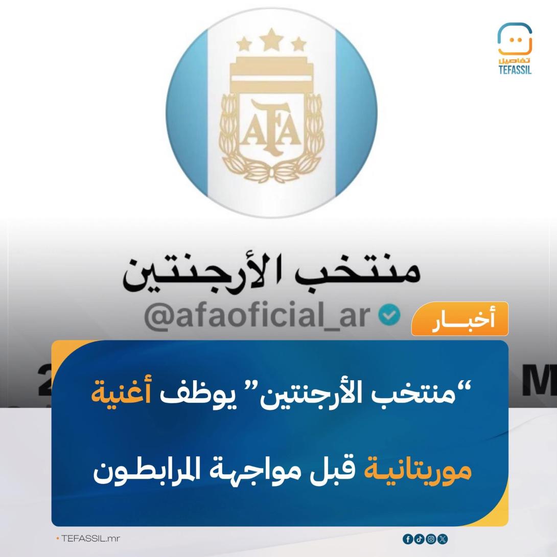 بدأ الحساب الرسمي للمنتخب الأرجنتيني باللغة العربية على منصة “تيك توك” في استخدام أغانٍ شعبية موريتانية، في خطوة لافتة تسبق المواجهة الودية المرتقبة مع المنتخب الوطني.