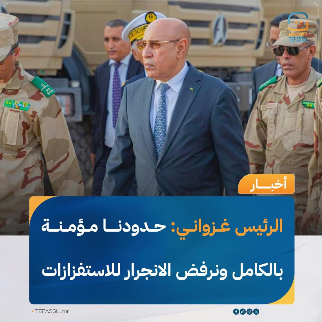 أكد رئيس الجمهورية محمد ولد الشيخ الغزواني أن موريتانيا تؤمن حدودها بشكل كامل، مشددا على أن القوات المسلحة منتشرة على طول الشريط الحدودي وتستخدم كافة الوسائل الضرورية لضمان أمنه.