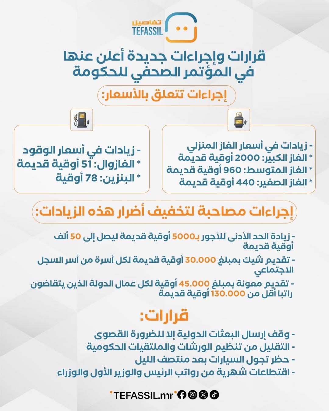 وللتخفيف من آثار هذه الزيادات، أعلنت الحكومة رفع الحد الأدنى للأجور إلى 50 ألف أوقية قديمة، ومنح دعم مالي بقيمة 30 ألف أوقية لفائدة أسر السجل الاجتماعي، إضافة إلى معونة بـ45 ألف أوقية للموظفين الذين تقل رواتبهم عن 130 ألف أوقية.