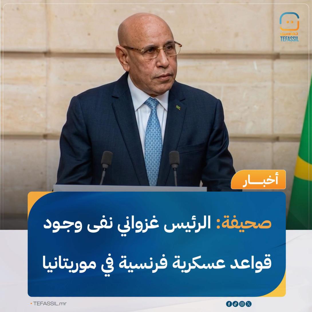 نقلت صحيفة الشرق الأوسط عن الرئيس محمد ولد الشيخ الغزواني تأكيده عدم وجود أي قواعد عسكرية فرنسية في موريتانيا، مشددا على أن التعاون القائم بين نواكشوط وباريس لا يتجاوز مجالات الدعم والتكوين.