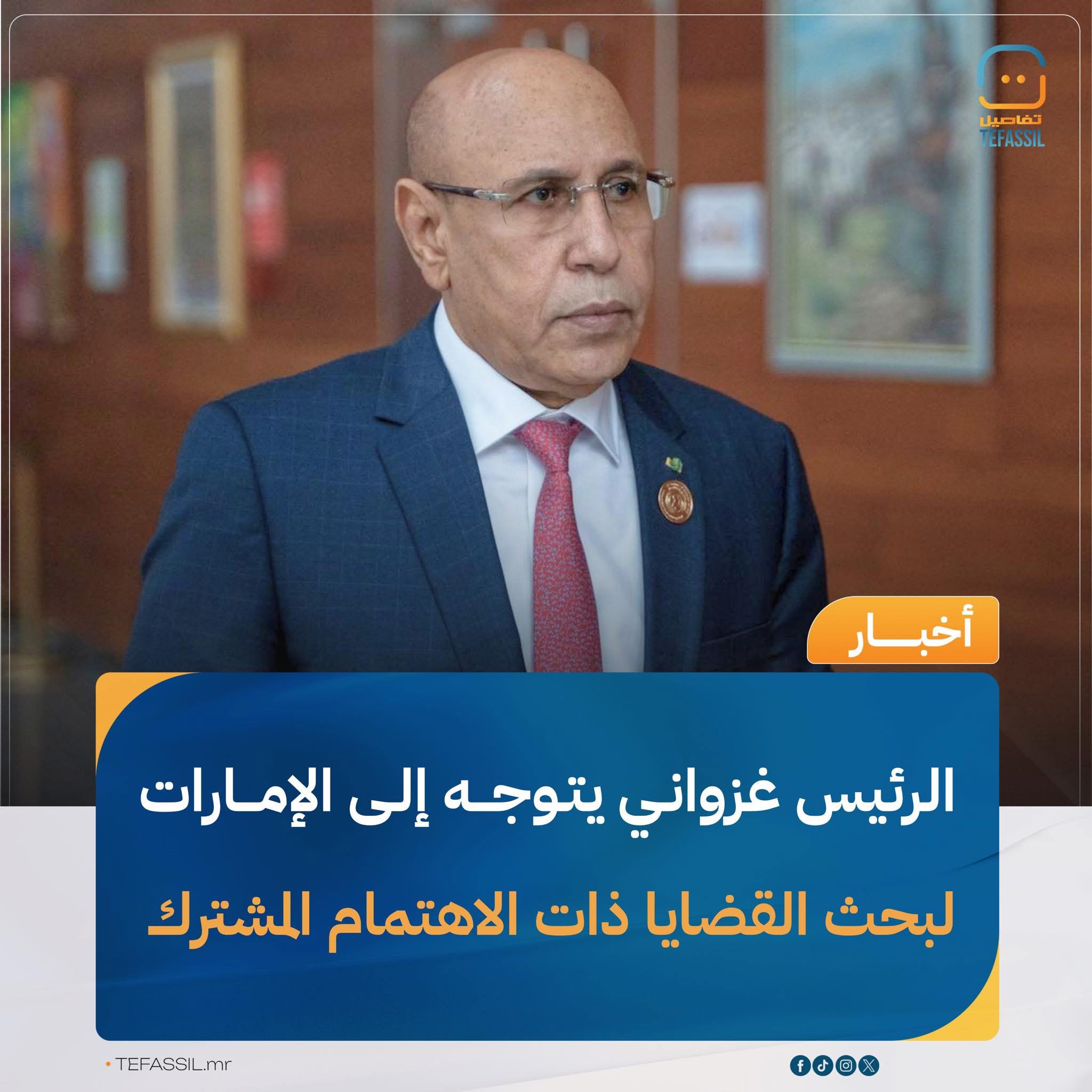 توجه رئيس الجمهورية محمد ولد الشيخ الغزواني، قبل قليل، إلى دولة الإمارات العربية المتحدة، في إطار زيارة رسمية.