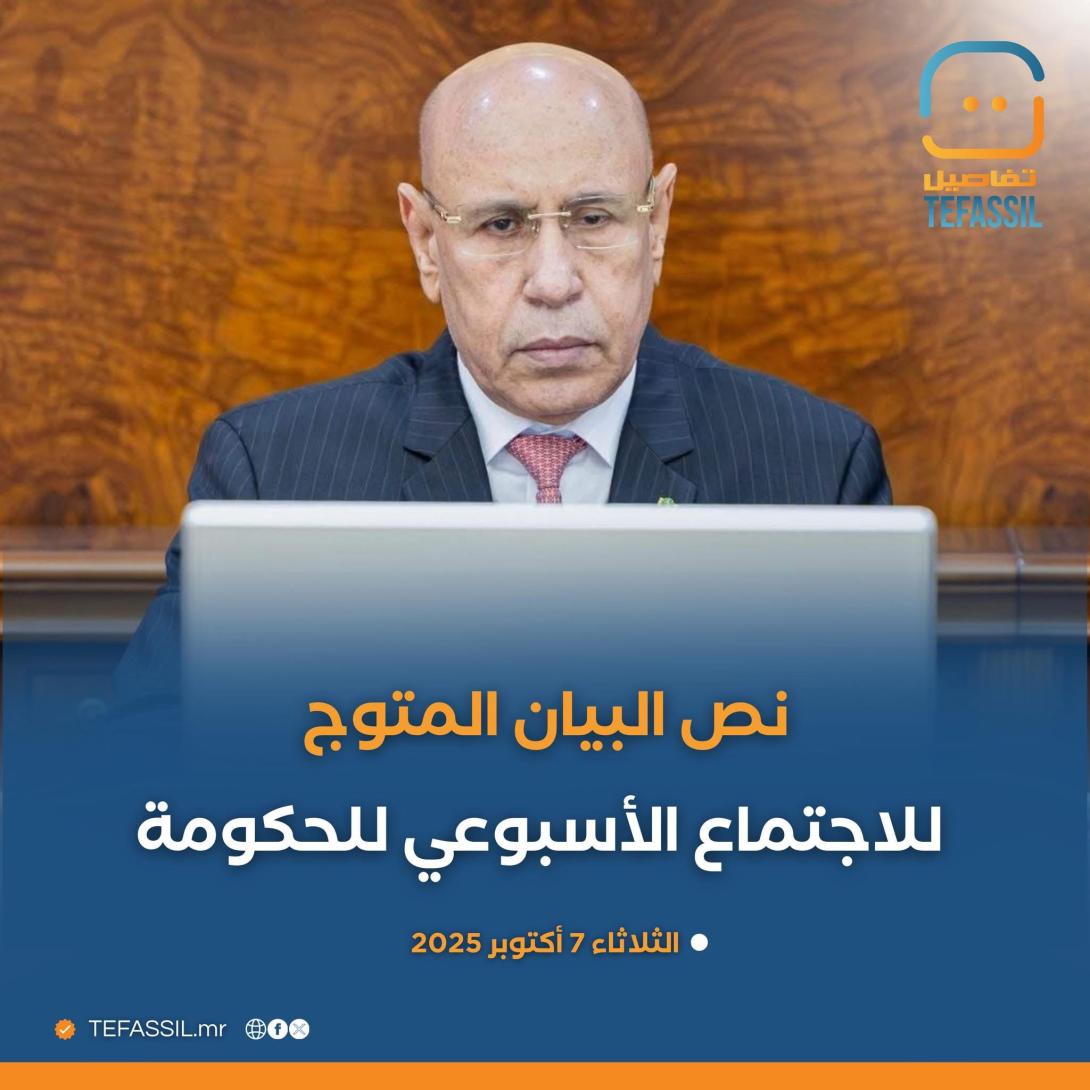 اجتمع مجلس الوزراء اليوم الثلاثاء 07 اكتوبر 2025، تحت رئاسة صاحب الفخامة السيد محمد ولد الشيخ الغزواني، رئيس الجمهورية.