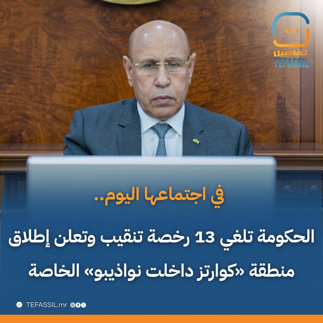 ألغت الحكومة الموريتانية، خلال اجتماعها الأسبوعي المنعقد اليوم الأربعاء 03 دجمبر 2025 تحت رئاسة رئيس الجمهورية السيد محمد ولد الشيخ الغزواني، ثلاث عشرة رخصة تنقيب معدني بعد ثبوت عدم التزام أصحابها بتقديم الضمانات البنكية الإلزامية المنصوص عليها في المادة 23 من المرسوم المنظم للامتيازات المعدنية والمقالع.