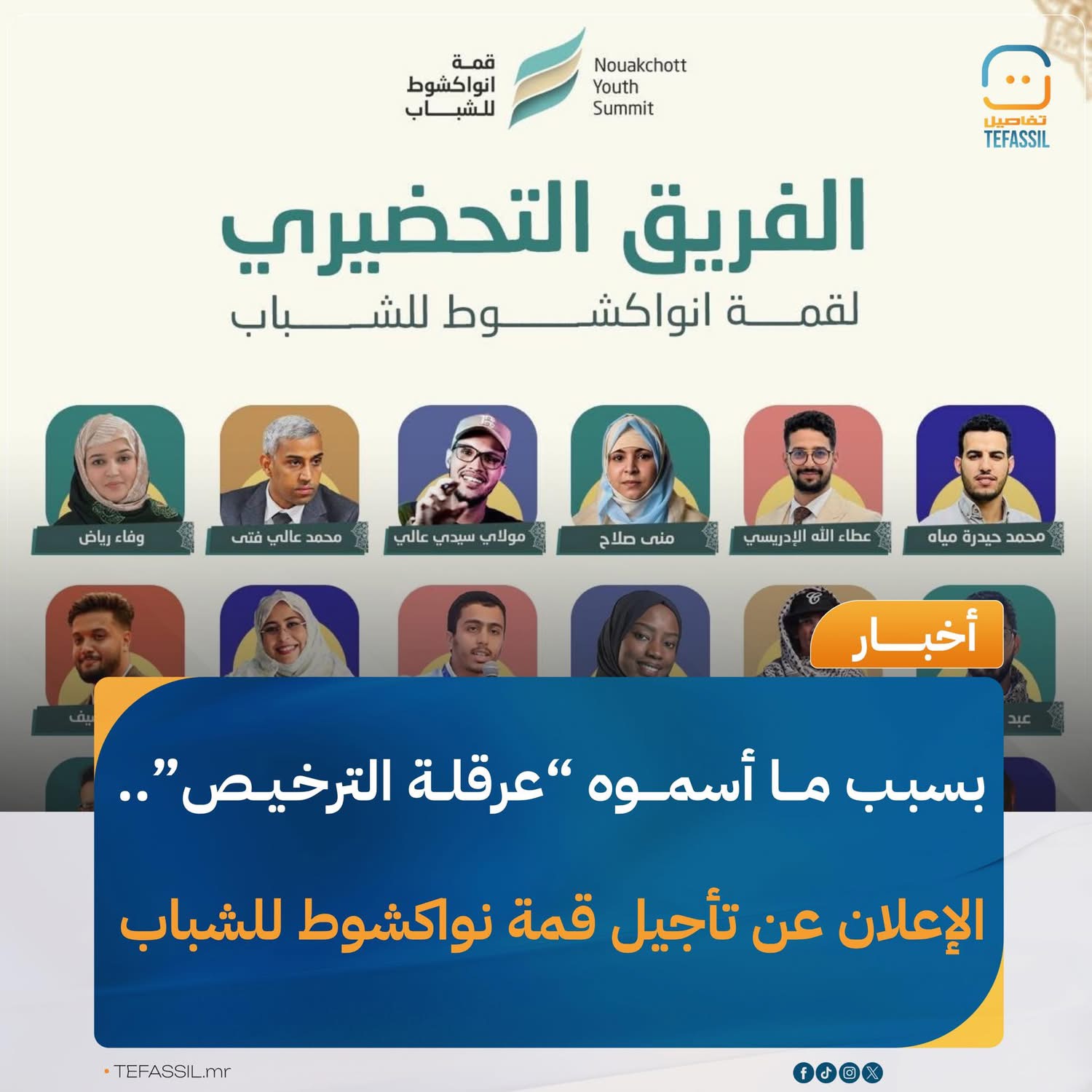 أعلنت اللجنة التحضيرية لقمة نواكشوط للشباب تأجيل فعاليات القمة التي كان من المقرر تنظيمها خلال الفترة المقبلة، مرجعة القرار إلى ما وصفته بـعرقلة منح الترخيص النهائي للحدث.