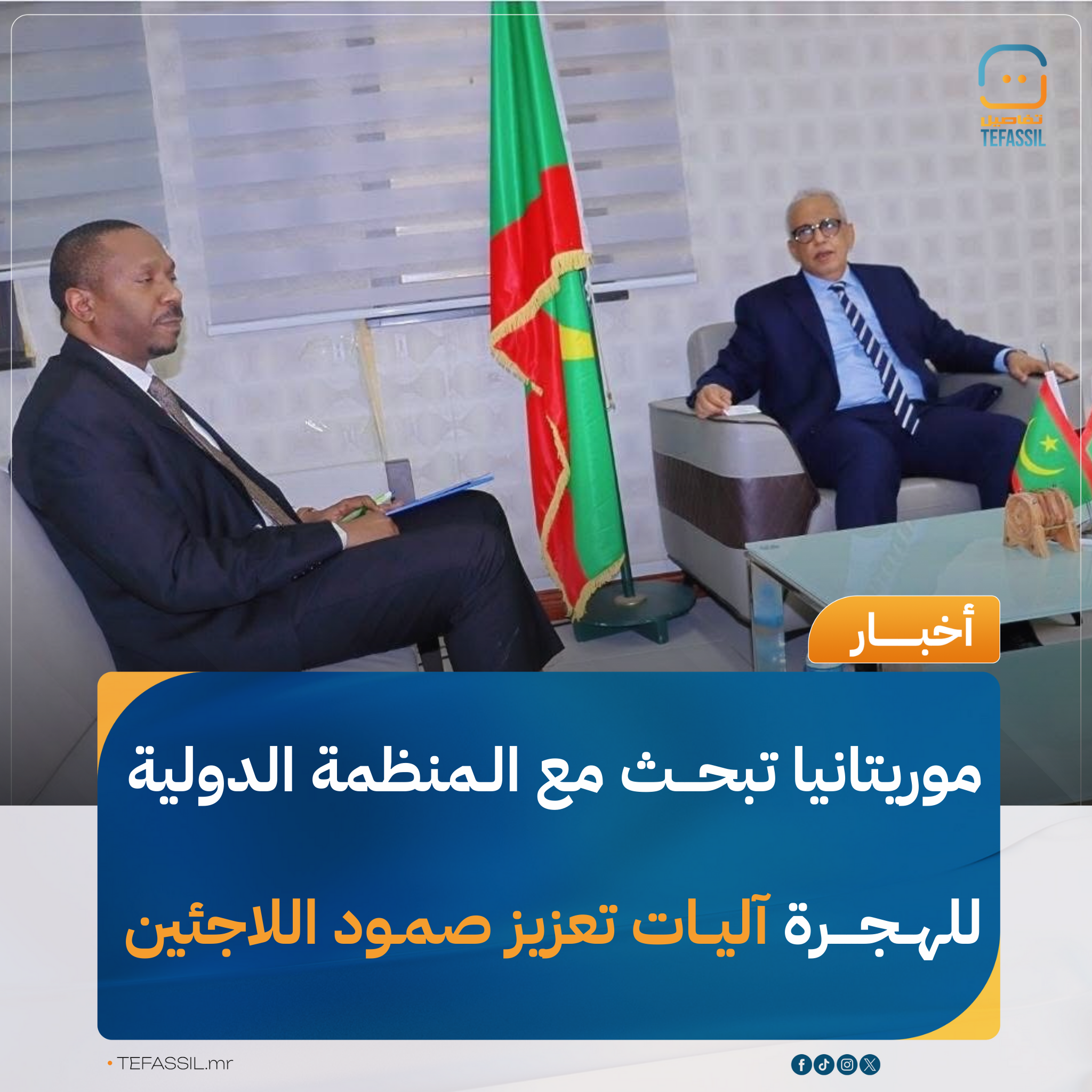 أجرى وزير الاقتصاد عبد الله ولد سليمان ولد الشيخ سيديا، اليوم الثلاثاء، في العاصمة نواكشوط، مباحثات مع رئيس بعثة المنظمة الدولية للهجرة في موريتانيا إدريس سومبار، حول سبل تعزيز صمود اللاجئين في البلاد.