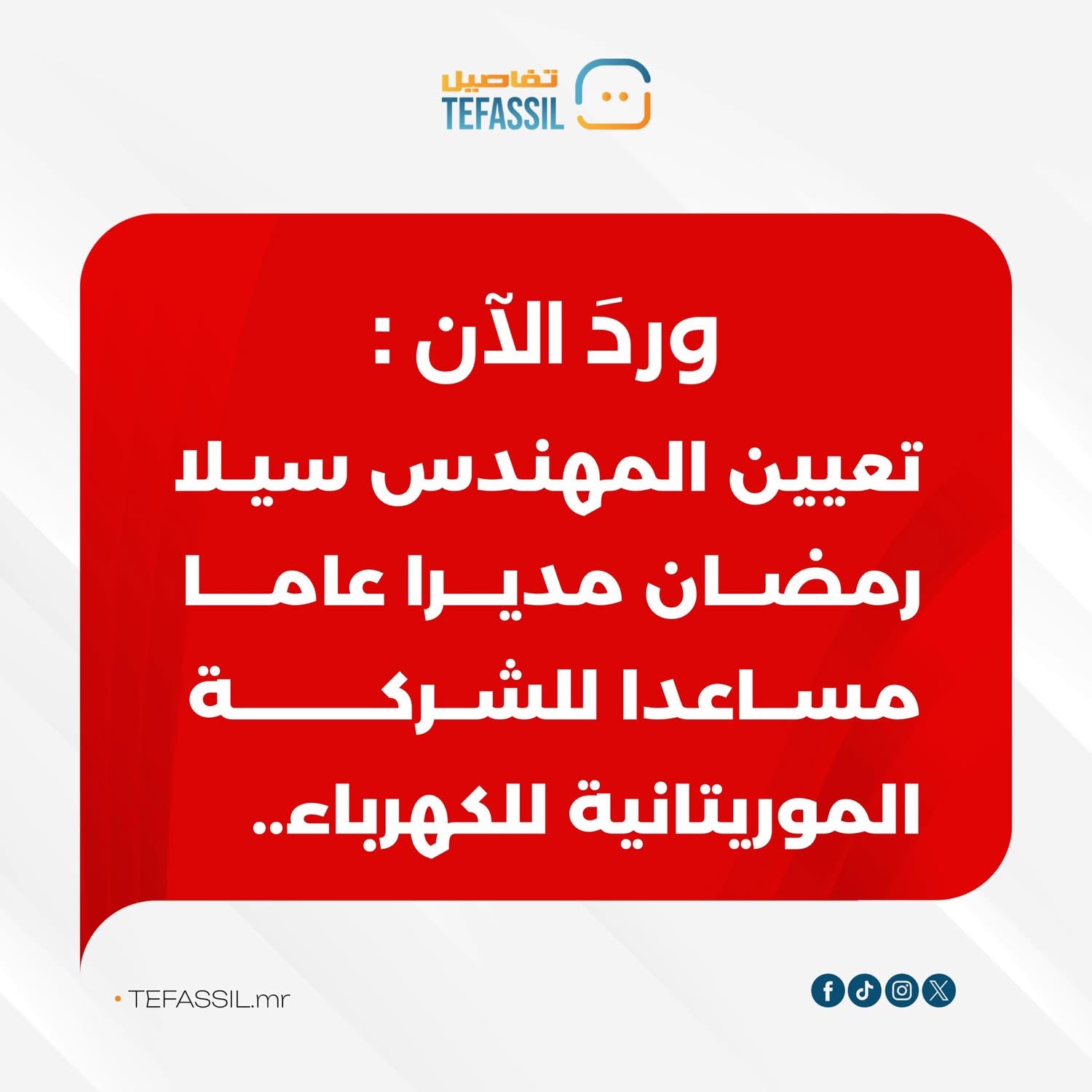 عينت الحكومة، في اجتماعها الأسبوعي المنعقد اليوم، المهندس سيلا رمضان مديرا عاما مساعدا للشركة الموريتانية للكهرباء، وذلك في إطار التعيينات التي صادق عليها مجلس الوزراء خلال اجتماعه.