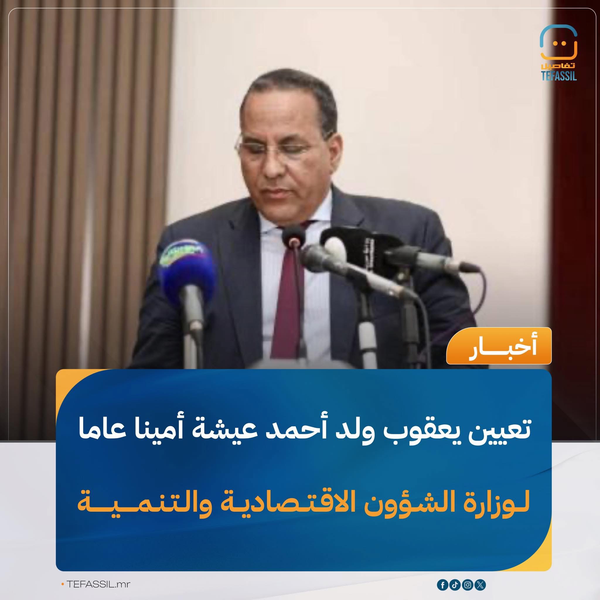 أكدت الحكومة، في اجتماعها الأسبوعي المنعقد اليوم، تعيين يعقوب ولد أحمد عيشة أمينا عاما لوزارة الشؤون الاقتصادية والتنمية، وذلك ضمن التعيينات التي صادق عليها مجلس الوزراء خلال اجتماعه.