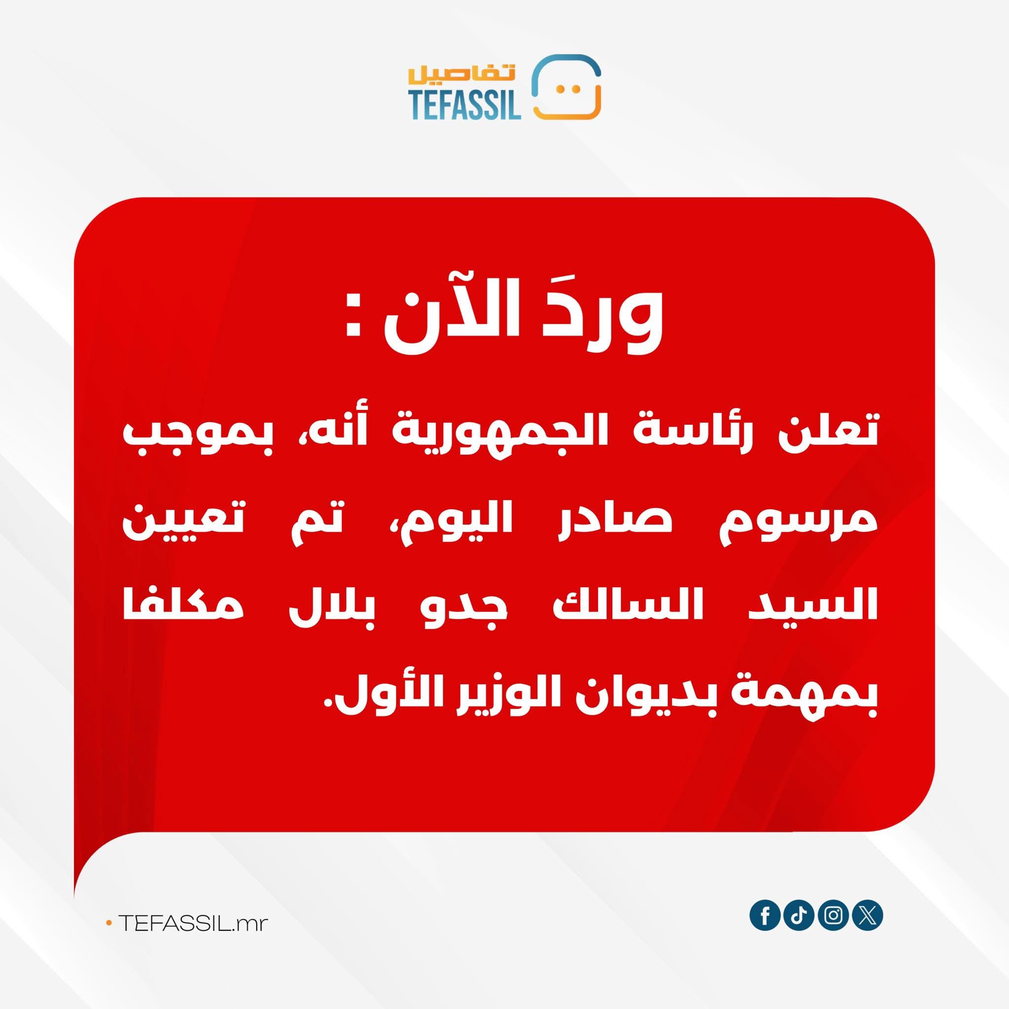 Jan 16 / التعليقات تعيين ولد بلال مكلفا بمهمة في ديوان الوزير الأول أعلنت رئاسة الجمهورية أنه، بموجب مرسوم صادر اليوم، تم تعيين السالك جدو بلال مكلفا بمهمة بديوان الوزير الأول. جمعة, 2026/01/16 - 12:54