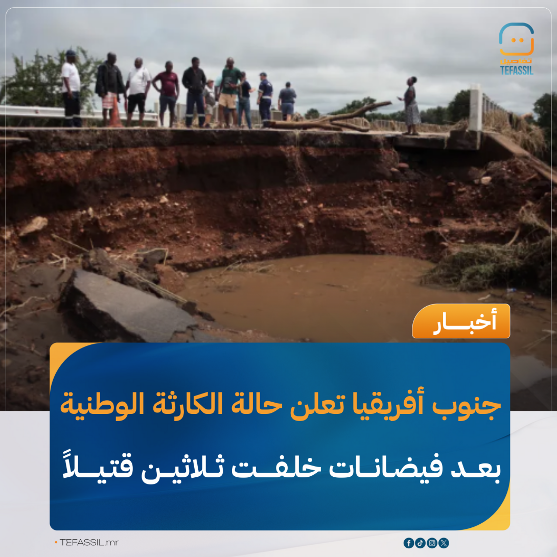أعلنت حكومة جنوب أفريقيا، اليوم الأحد، حالة الكارثة الوطنية عقب فيضانات جارفة أودت بحياة ما لا يقل عن 30 شخصا في شمال شرق البلاد، وألحقت أضرارا واسعة بآلاف المنازل والبنى التحتية.