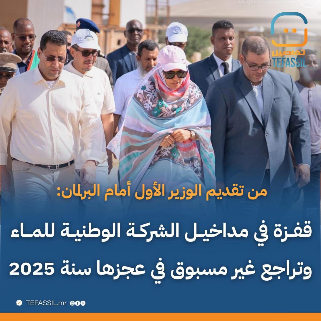 وأوضح الوزير الأول أن مداخيل الشركة الوطنية للماء ارتفعت خلال سنة 2025 بحوالي 2.4 مليار أوقية قديمة مقارنة بالسنة الماضية، في مؤشر يعكس تحسنا ملموسا في الأداء المالي للشركة.