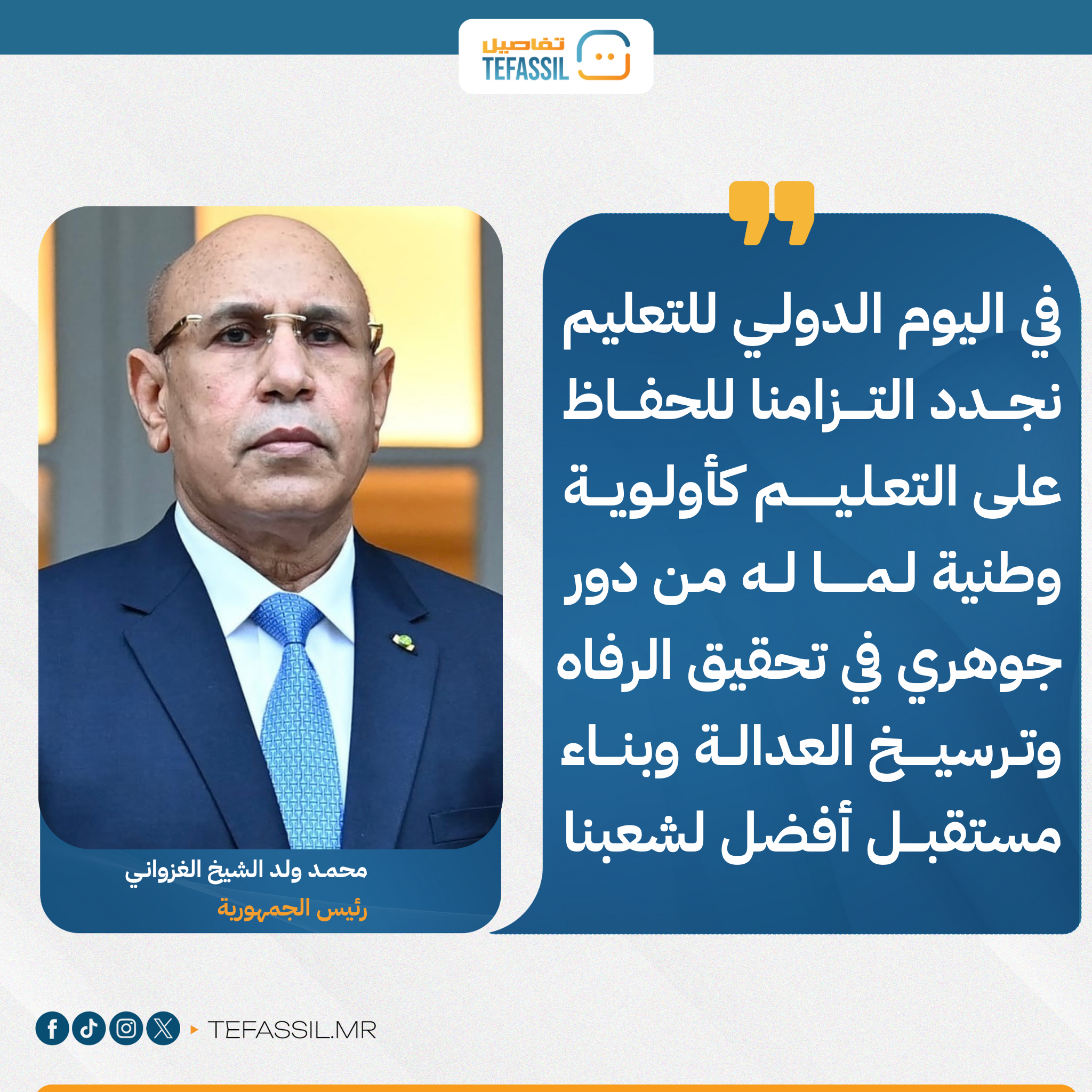 وأوضح رئيس الجمهورية، في تغريدة نشرها على حسابه الرسمي بمنصة إكس، أن التعليم يشكل ركيزة أساسية لتحقيق الرفاه، وترسيخ العدالة، وبناء مستقبل أفضل للشعب الموريتاني.
