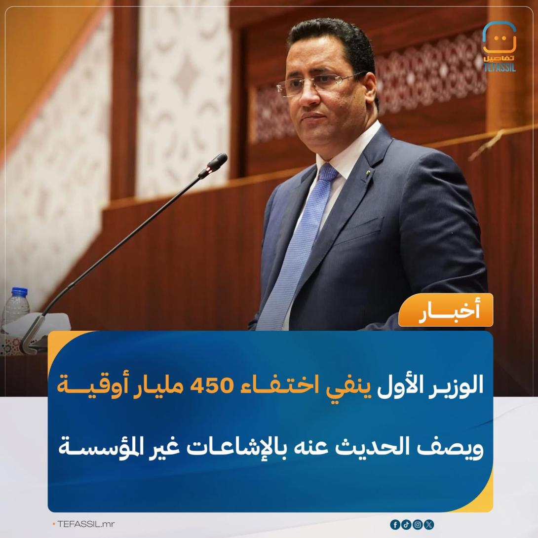 نفى الوزير الأول المختار ولد اجاي صحة ما تم تداوله بشأن اختفاء مبلغ 450 مليار أوقية، معتبرا أن ذلك استناد غير دقيق إلى تقرير محكمة الحسابات، وداعيا إلى العودة إلى نص التقرير لقراءة مضمونه بعيدا عن التأويلات.