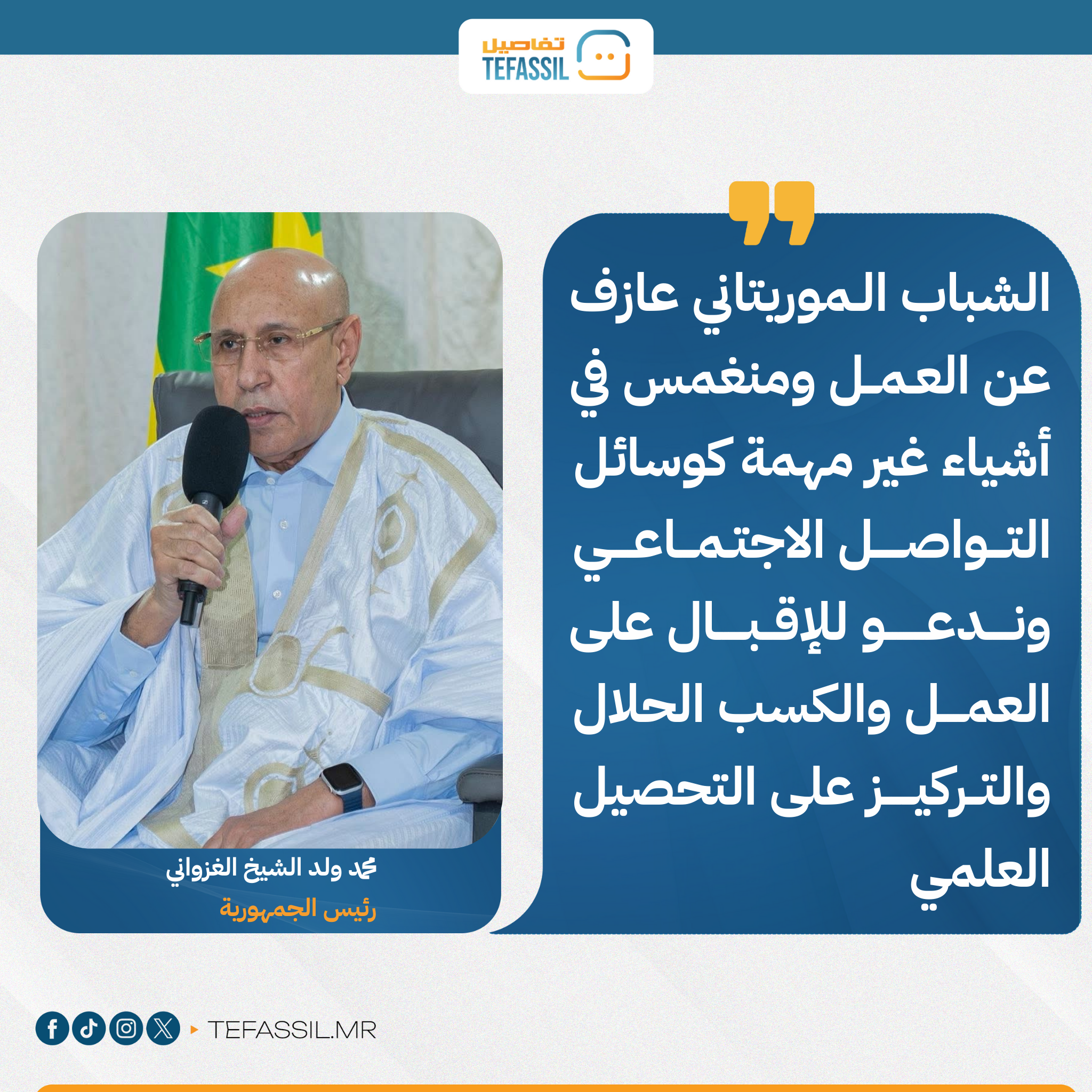 قال الرئيس محمد ولد الشيخ الغزواني إن الشباب الموريتاني عازف عن العمل ومنغمس في أشياء غير مهمة كوسائل التواصل الاجتماعي.