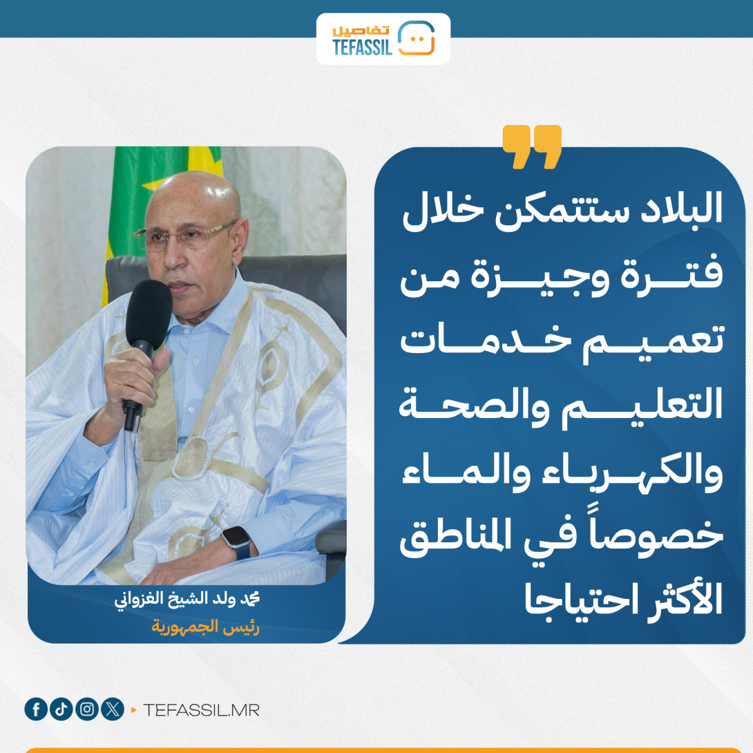 قال الرئيس محمد ولد الشيخ الغزواني إن موريتانيا ستتمكن خلال فترة وجيزة من تعميم خدمات التعليم والصحة والكهرباء والماء، خصوصا في المناطق الأكثر احتياجا.