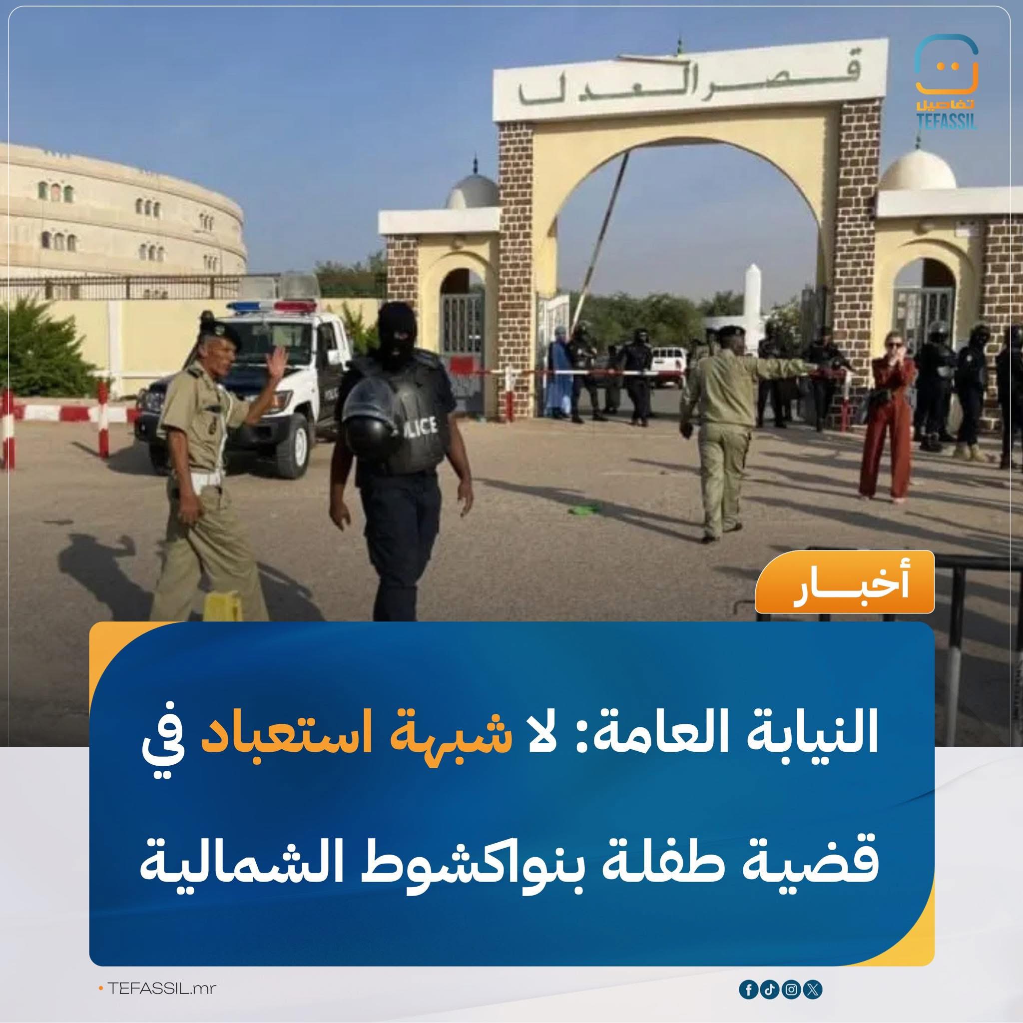 قالت النيابة العامة إن التحقيقات التي أجريت بشأن قضية طفلة تبلغ 11 سنة، أُثيرت بداية فبراير الجاري في ولاية نواكشوط الشمالية، خلصت إلى عدم وجود أي أساس للاشتباه في علاقة استعباد بينها وبين الأسرة التي كانت تقيم لديها.