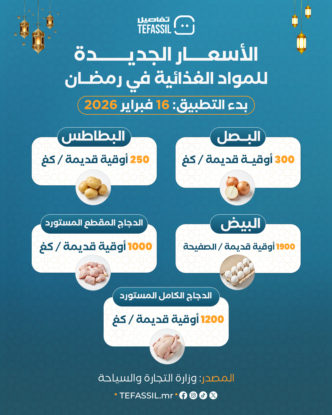 تدخل الأسعار الجديدة لبعض المواد الغذائية الأساسية حيز التطبيق ابتداء من اليوم، وذلك في إطار الاتفاق الموقّع بين وزارة التجارة والسياحة والفاعلين في قطاع التموين، بهدف استقرار السوق وضمان توفر هذه المواد بأسعار مناسبة خلال شهر رمضان.