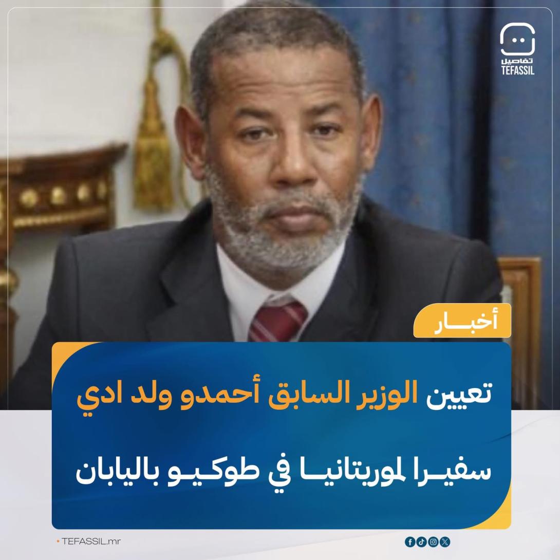 Feb 20 / التعليقات تعيين الوزير السابق ولد ادي سفيرا لموربتانيا في طوكيو باليابان أفادت مصادر مطلعة لتفاصيل تعيين الوزير السابق أحمدو ولد ادي سفيرا للجمهورية الإسلامية الموريتانية في طوكيو باليابان. جمعة, 2026/02/20 - 16:33