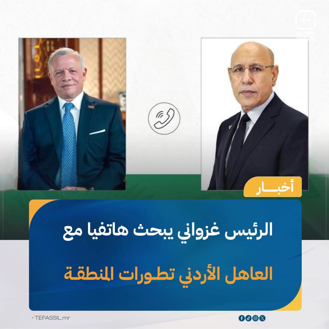 أجرى رئيس الجمهورية محمد ولد الشيخ الغزواني، اليوم، اتصالا هاتفيا بالعاهل الأردني الملك عبد الله الثاني ابن الحسين، خُصص لاستعراض التطورات الإقليمية الراهنة وتبادل وجهات النظر بشأنها.
