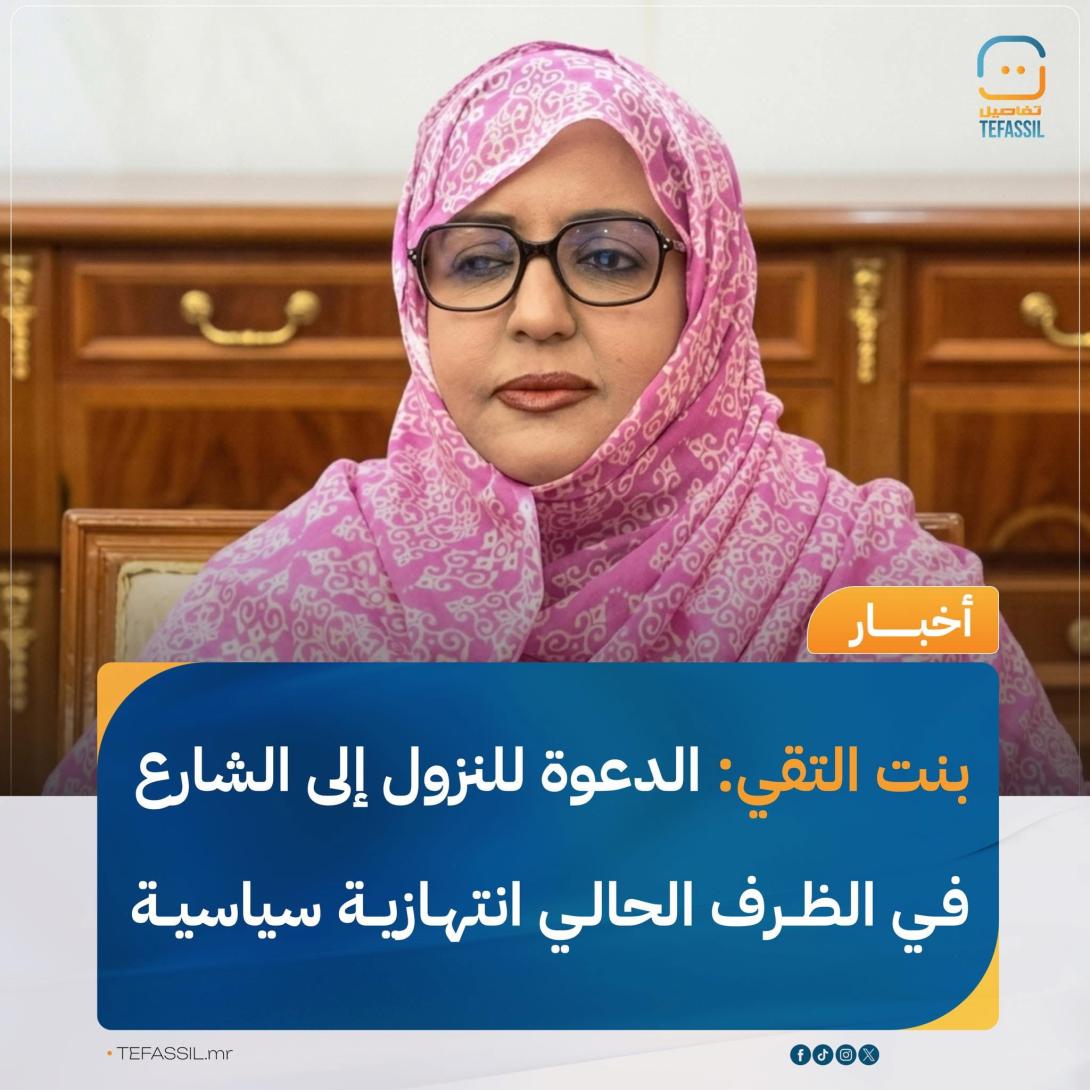وقالت بنت التقي، في تدوينة لها، إن موريتانيا تمر بظرف استثنائي متأثر بأزمة عالمية وتوترات أمنية في محيطها، ما يستدعي، بحسب تعبيرها، تأجيل الاصطفافات السياسية والابتعاد عن التجييش.