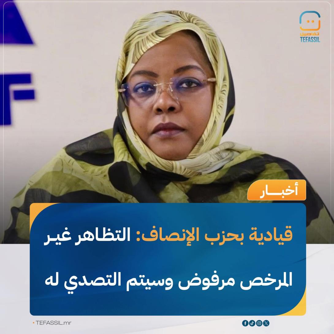 قالت خديجة بنت اسقير ولد امبارك، الأمينة الدائمة المكلفة بالسيادة الطاقية والمحروقات في حزب الإنصاف، إن التظاهر غير المرخص “غير مقبول”، مؤكدة أن السلطات الإدارية تتحرك في إطار الحفاظ على الأمن والاستقرار.