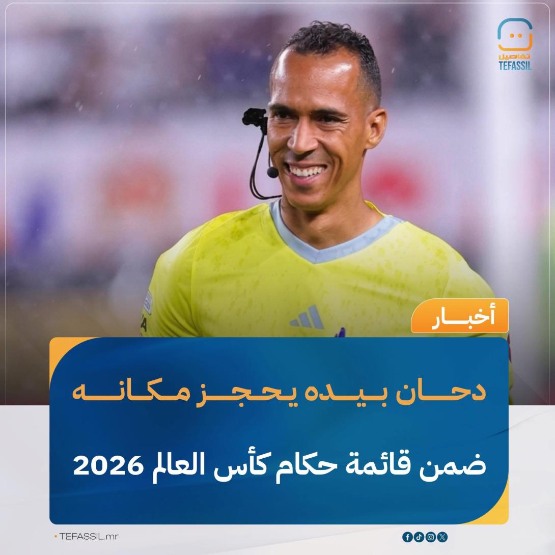 أعلن الاتحاد الدولي لكرة القدم (FIFA) قائمة الحكام المعتمدين لإدارة مباريات كأس العالم 2026، والتي ضمت الحكم الموريتاني دحان بيده.