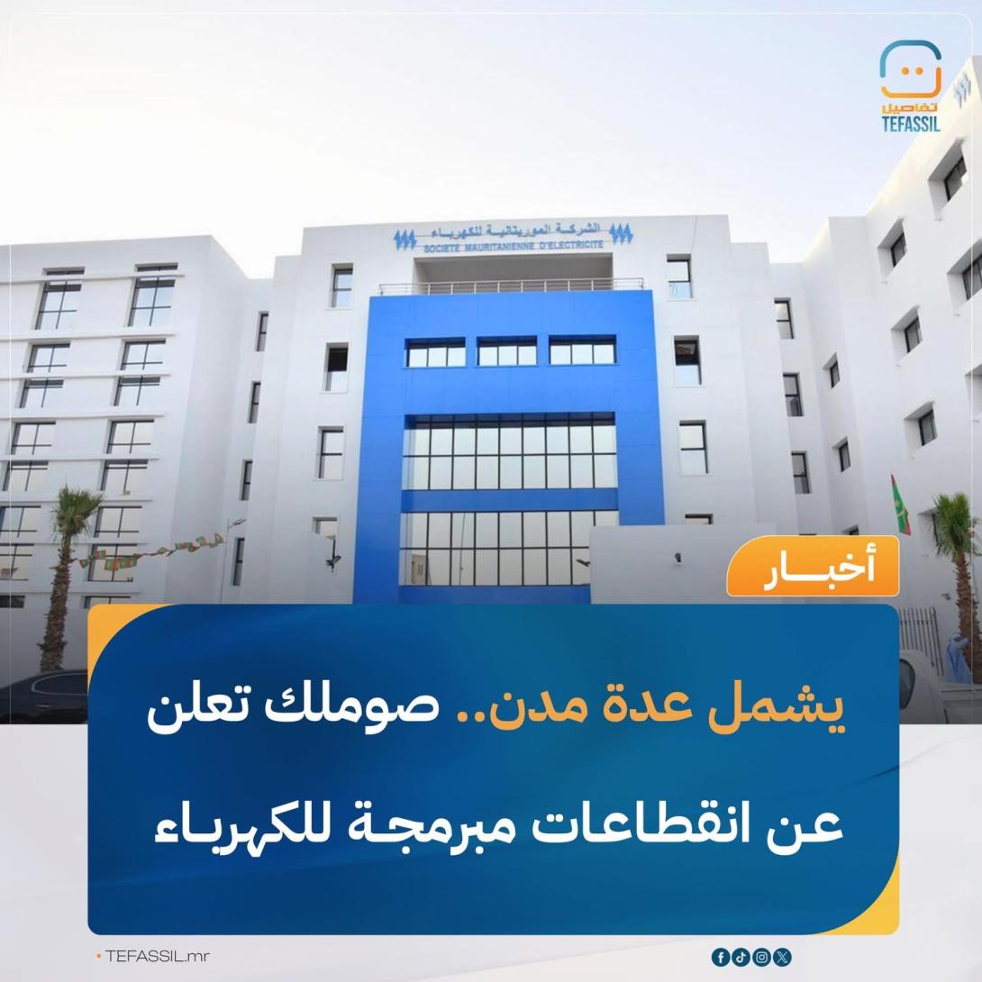 أعلنت مجموعة صوملك أن انقطاعًا محدودًا للتيار الكهربائي سيشمل يوم السبت 25 أبريل 2026 مدن كيهيدي، بوكي، مقطع لحجار، آلاك، بوتلميت، إضافة إلى القرى الواقعة على طول المحور المعني، وذلك من الساعة 07:00 صباحًا إلى 08:00 صباحًا.