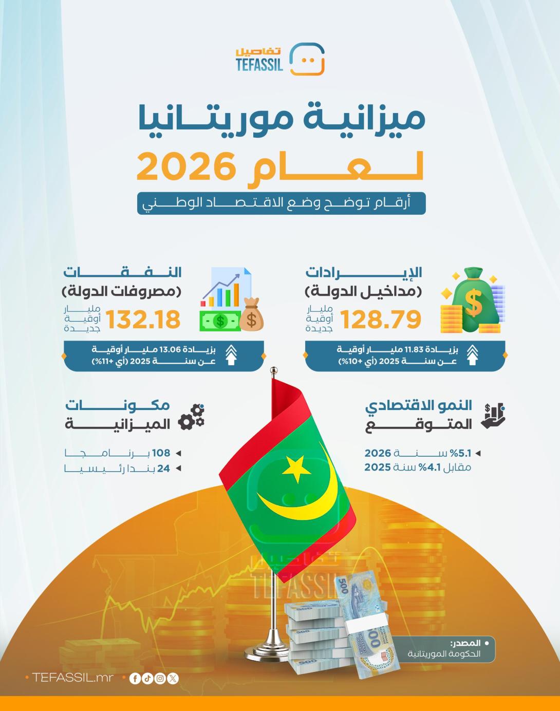 أعلنت الحكومة الموريتانية عن الأرقام الرئيسية لمشروع ميزانية الدولة لسنة 2026، والتي تتألف من 108 برامج و24 مخصصاً.