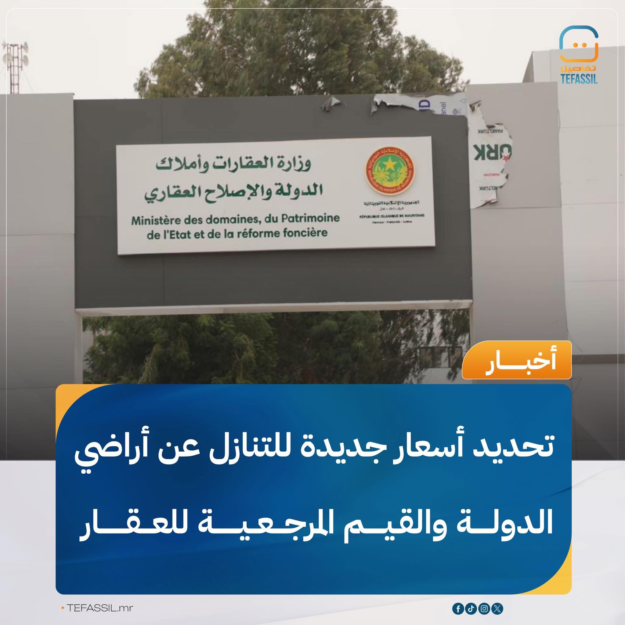 أصدرت وزارة العقارات وأملاك الدولة والإصلاح العقاري مقررا جديدا يحدد أسعار التنازل عن قطع الأراضي المملوكة للدولة، إضافة إلى القيم المنصفة المرجعية المعتمدة في مختلف ولايات البلاد، بما فيها نواكشوط وولايات الداخل.