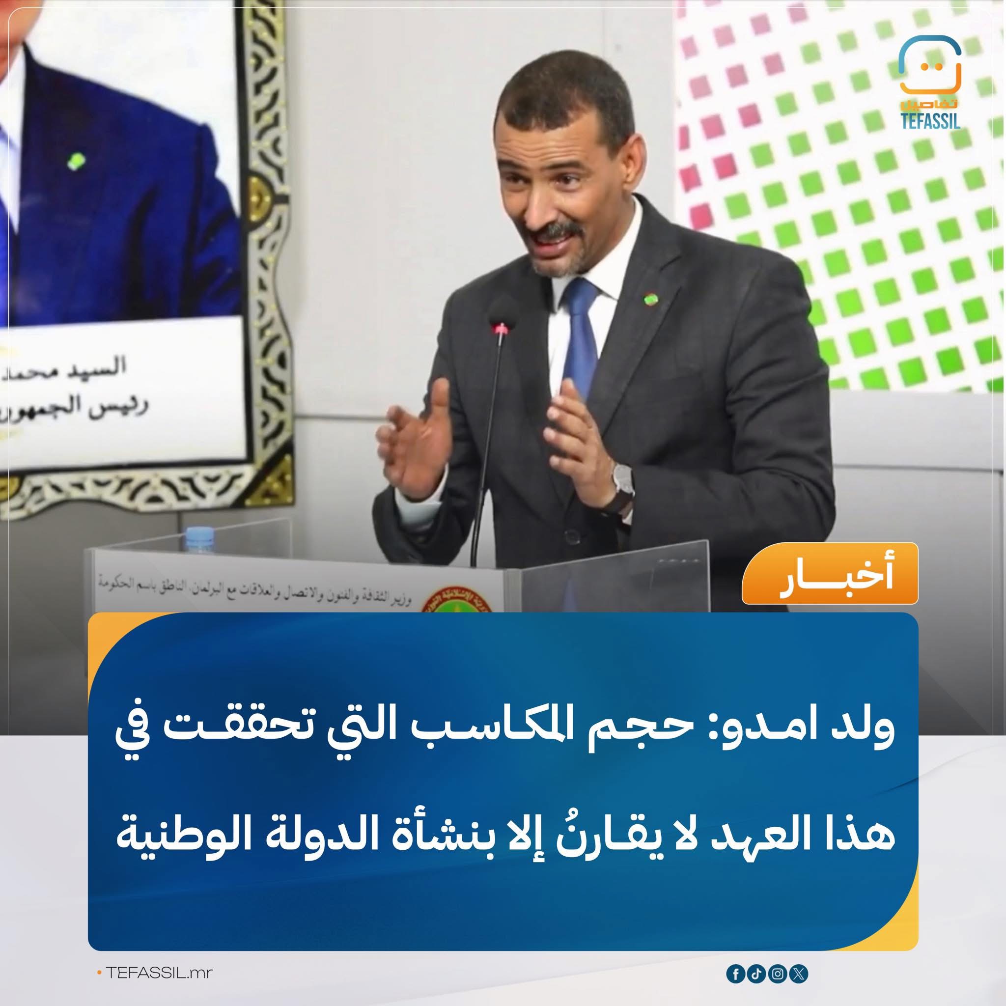 قال الوزير الناطق الرسمي باسم الحكومة، الحسين ولد امدو، إن موريتانيا منذ تأسيسها ساهم كل نظام فيها بوضع لبنة وتحقيق مكاسب، غير أن الإنصاف يقتضي الاعتراف بخصوصية الوضعية الحالية، مؤكدا أن المكاسب التنموية التي تحققت خلال هذا العهد لا يمكن قياسها بأي عهد سابق، ولا تُقارن إلا بنشأة الدولة الوطنية.