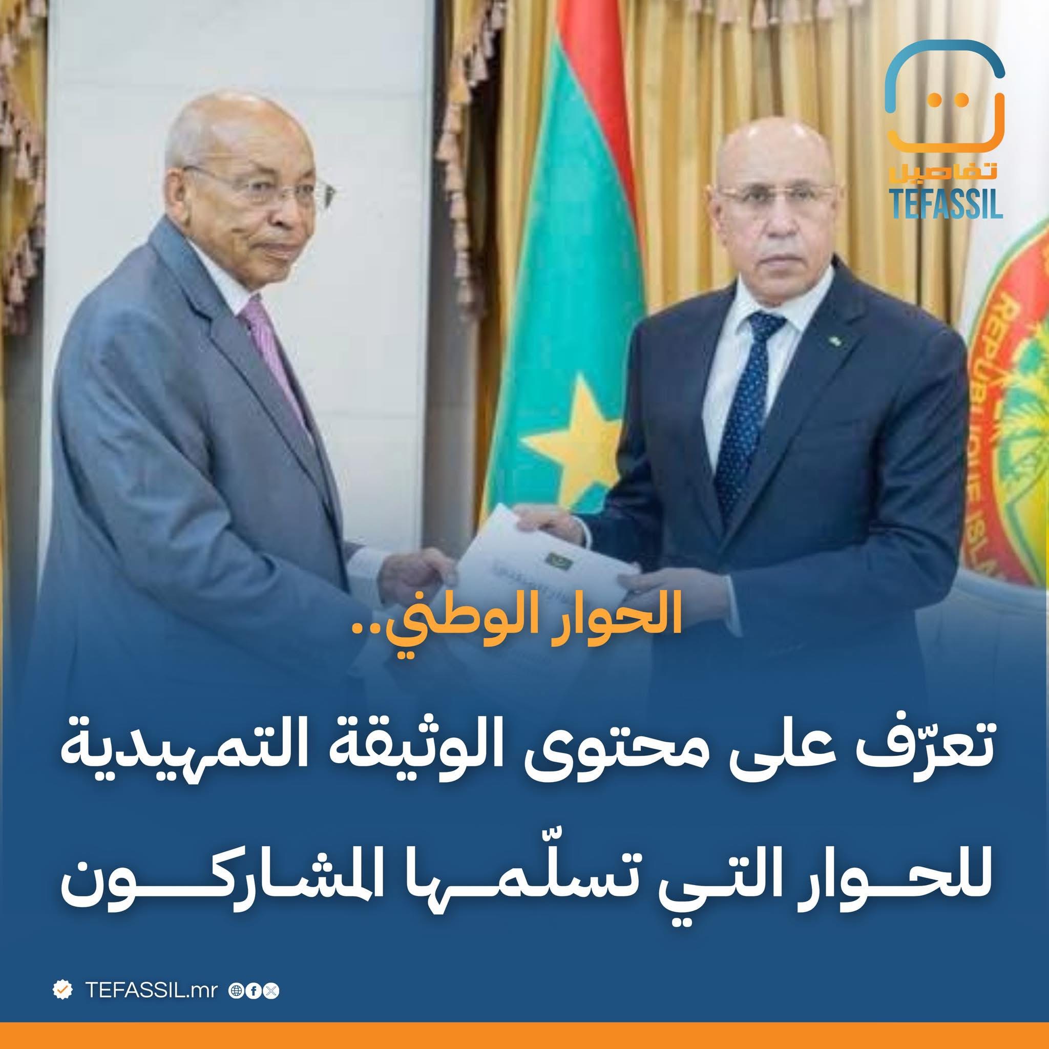 ويأتي تسليم هذه الوثيقة في أعقاب لقاء قصير جمع رئيس الجمهورية محمد ولد الشيخ الغزواني بالمشاركين في مسار الحوار، في إطار الخطوات التمهيدية الجارية لإطلاق حوار سياسي مرتقب.