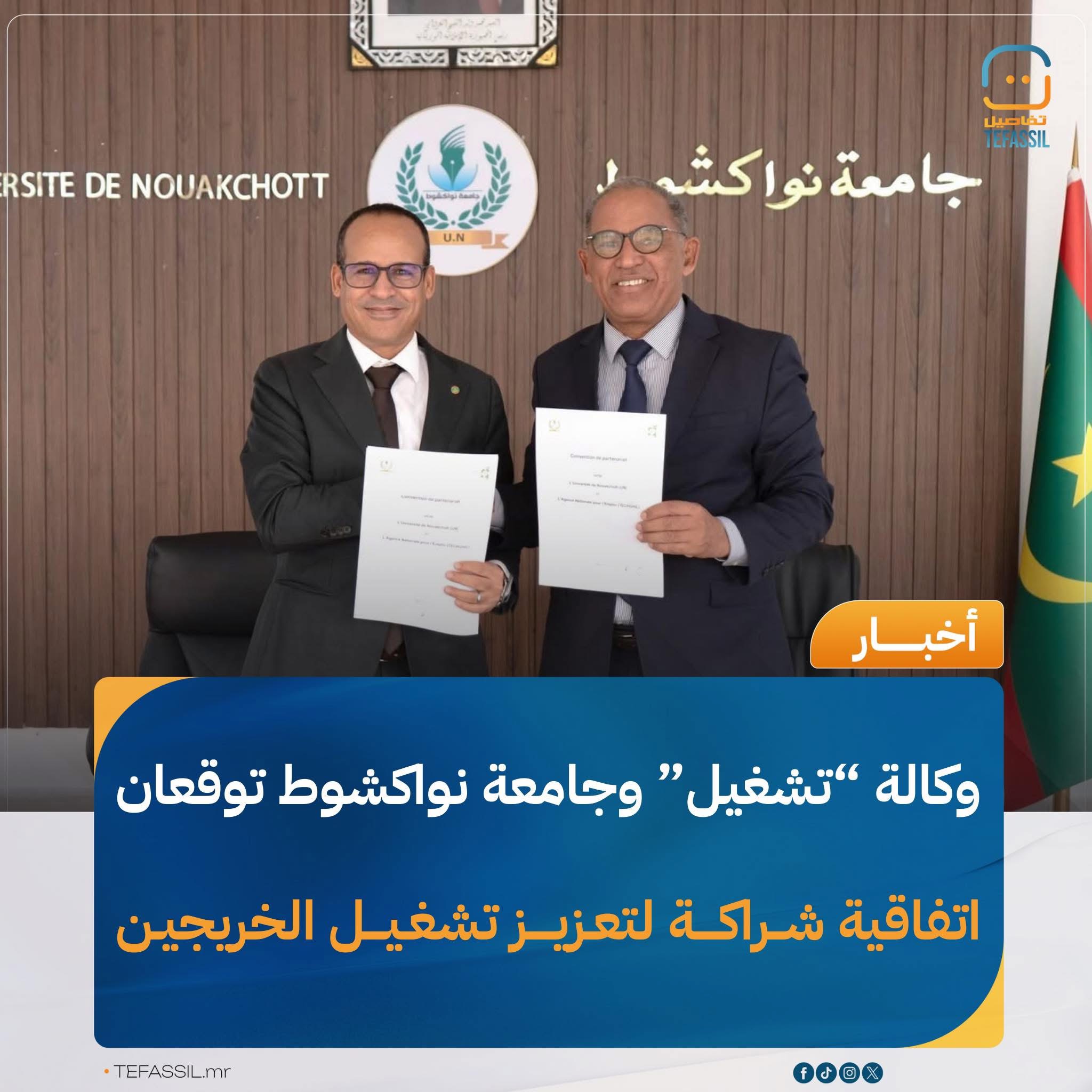 وقّعت الوكالة الوطنية للتشغيل (تشغيل) وجامعة نواكشوط اتفاقية شراكة استراتيجية تهدف إلى تعزيز قابلية تشغيل الخريجين ومواكبتهم للاندماج في سوق العمل، ودعم المشاريع الريادية، ومواءمة التكوين الأكاديمي مع متطلبات السوق.
