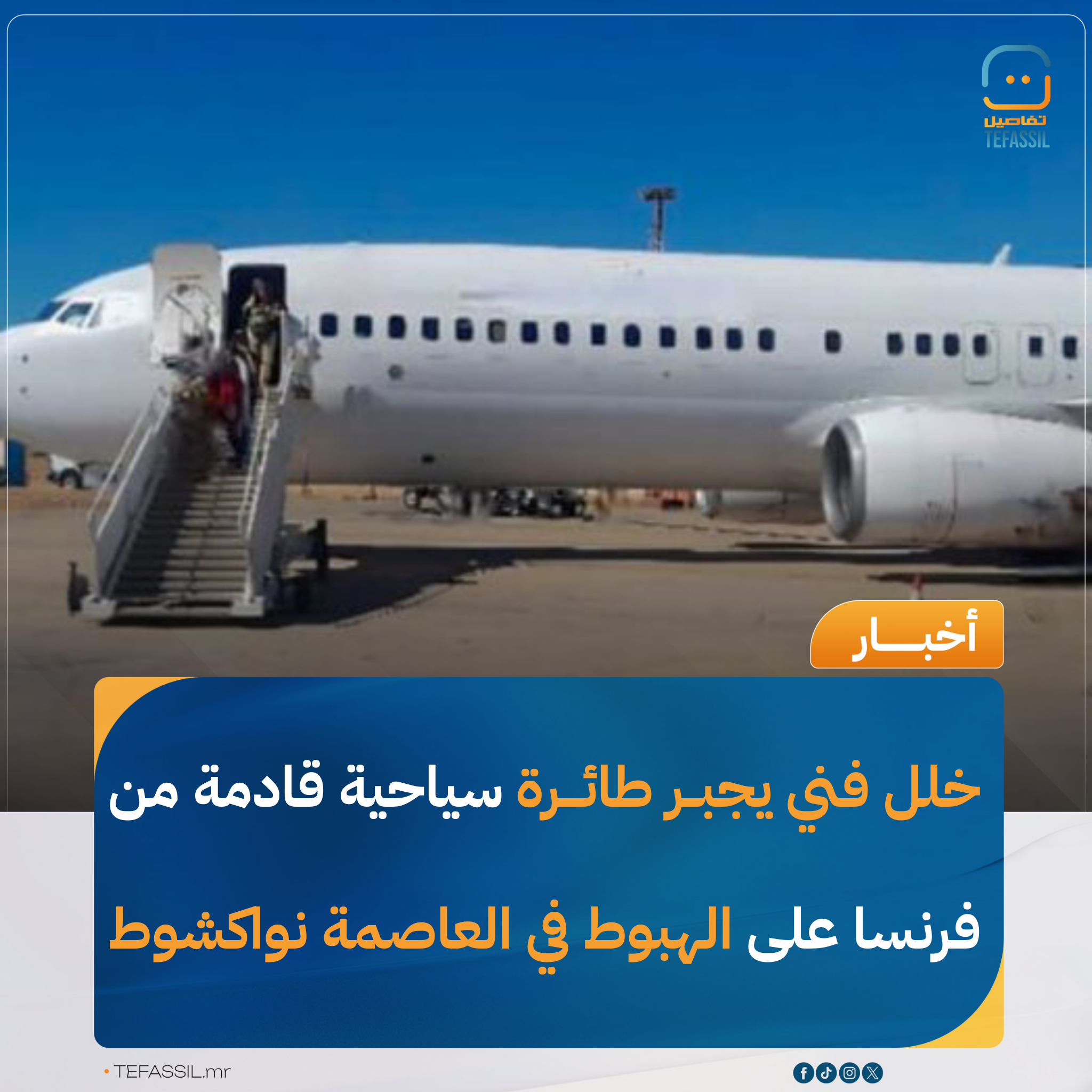 هبطت، صباح اليوم السبت، طائرة تقل مجموعة من السياح القادمين من فرنسا، بمطار نواكشوط الدولي "أم التونسي" بدلاً من مطار أطار الدولي، وذلك عقب تعرضها لخلل فني طارئ أثناء الرحلة.