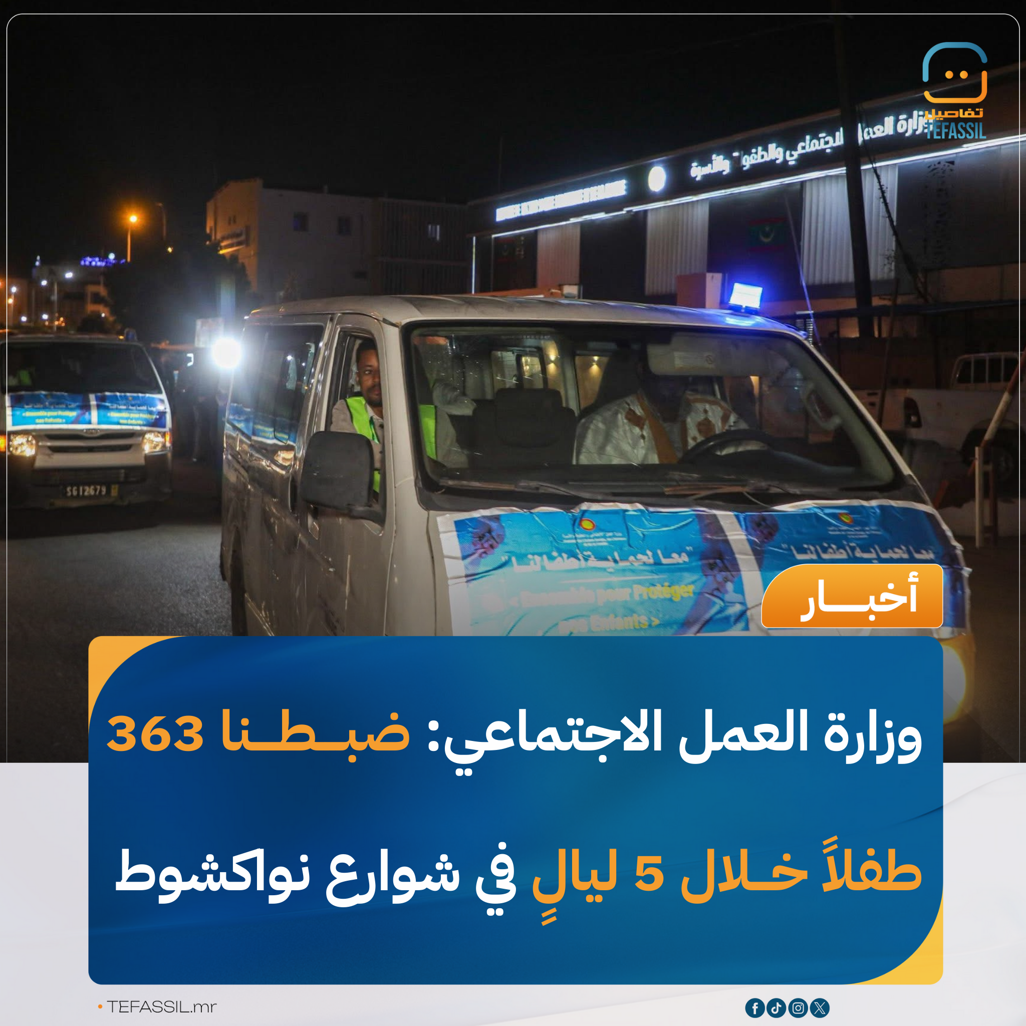 أعلنت وزارة العمل الاجتماعي عن ضبط 363 طفلاً متواجدين في شوارع العاصمة نواكشوط خلال الأيام الخمسة الأولى من العملية الميدانية الليلية لحماية الأطفال.