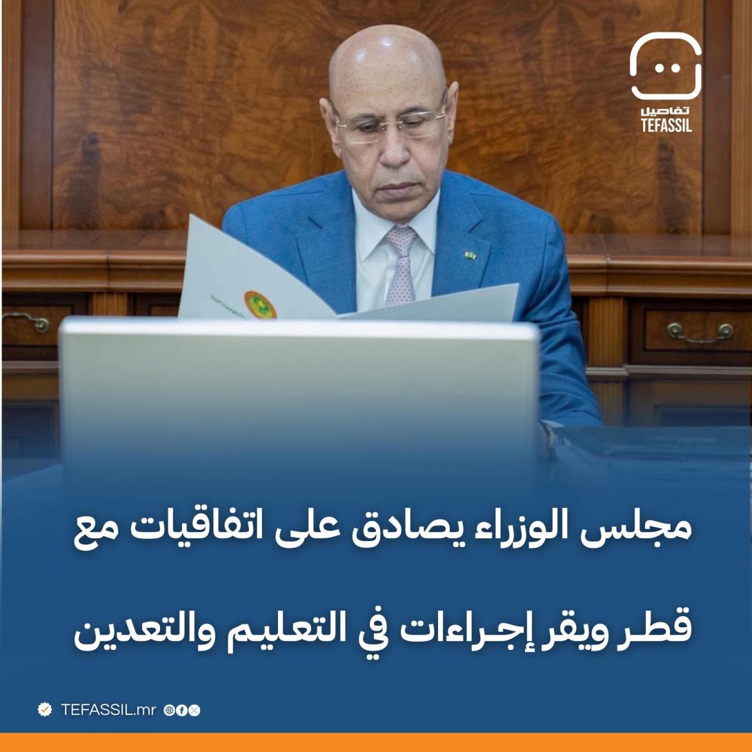 اجتمع مجلس الوزراء، اليوم الأربعاء في نواكشوط، تحت رئاسة رئيس الجمهورية محمد ولد الشيخ الغزواني، حيث صادق على جملة من مشاريع القوانين والمراسيم، إلى جانب دراسة عدة بيانات تتعلق بالشأنين الاقتصادي والاجتماعي.