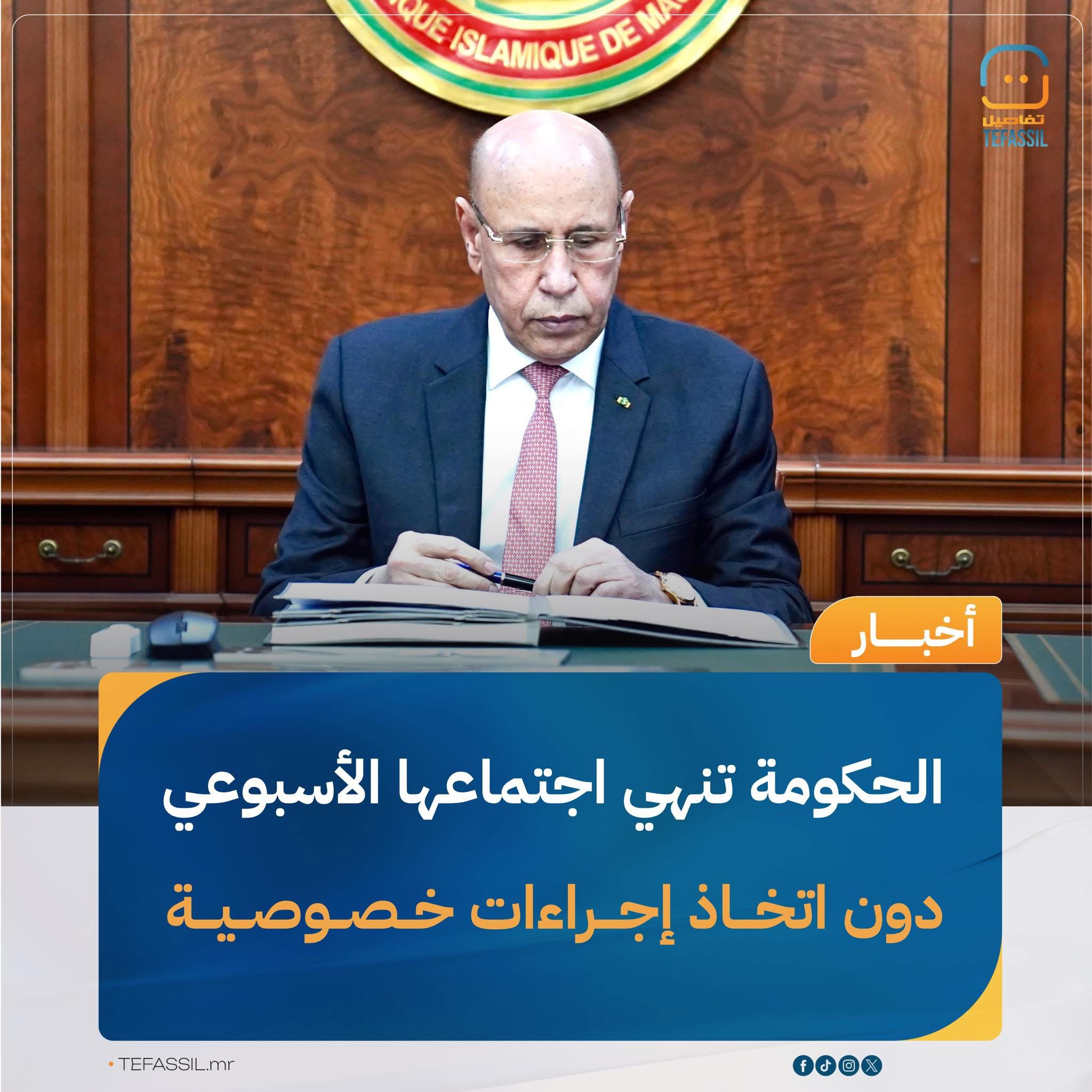 أنهت الحكومة اجتماعها الأسبوعي، اليوم الأربعاء، في القصر الرئاسي بنواكشوط، برئاسة رئيس الجمهورية محمد ولد الشيخ الغزواني، دون اتخاذ إجراءات خصوصية.